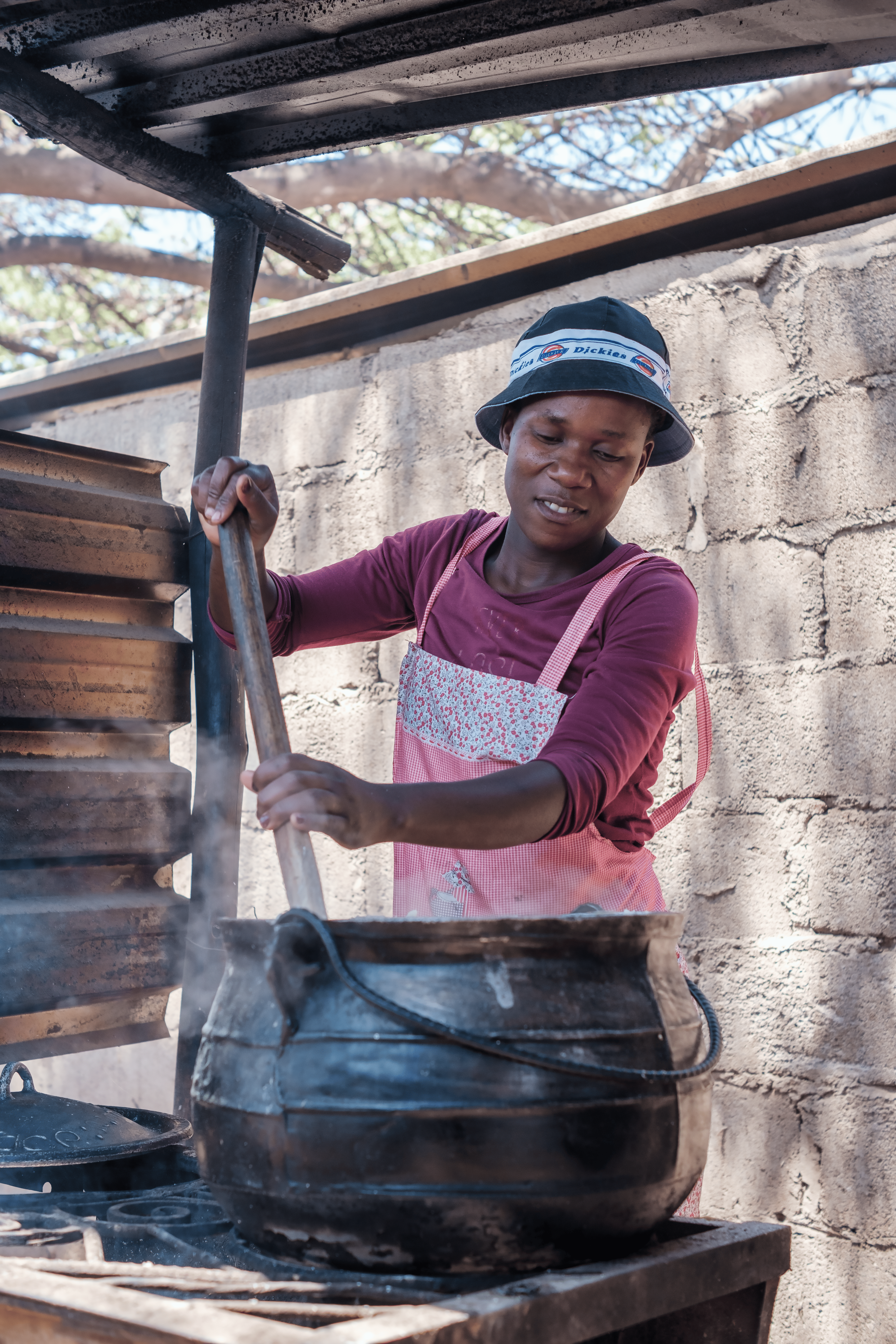 Vor den kleinen Läden in Entumbane steigt sanft Rauch aus einem dreibeinigen Topf, der auf einem Grillrost steht. Darin rührt Nomathemba Dube stetig den Sadza – den dicken, cremigen Maisbrei, der das Grundnahrungsmittel in Simbabwe ist. Mit Geduld und Routine bereitet sie die Mahlzeit zu, die zu ihrer Lebensgrundlage geworden ist.