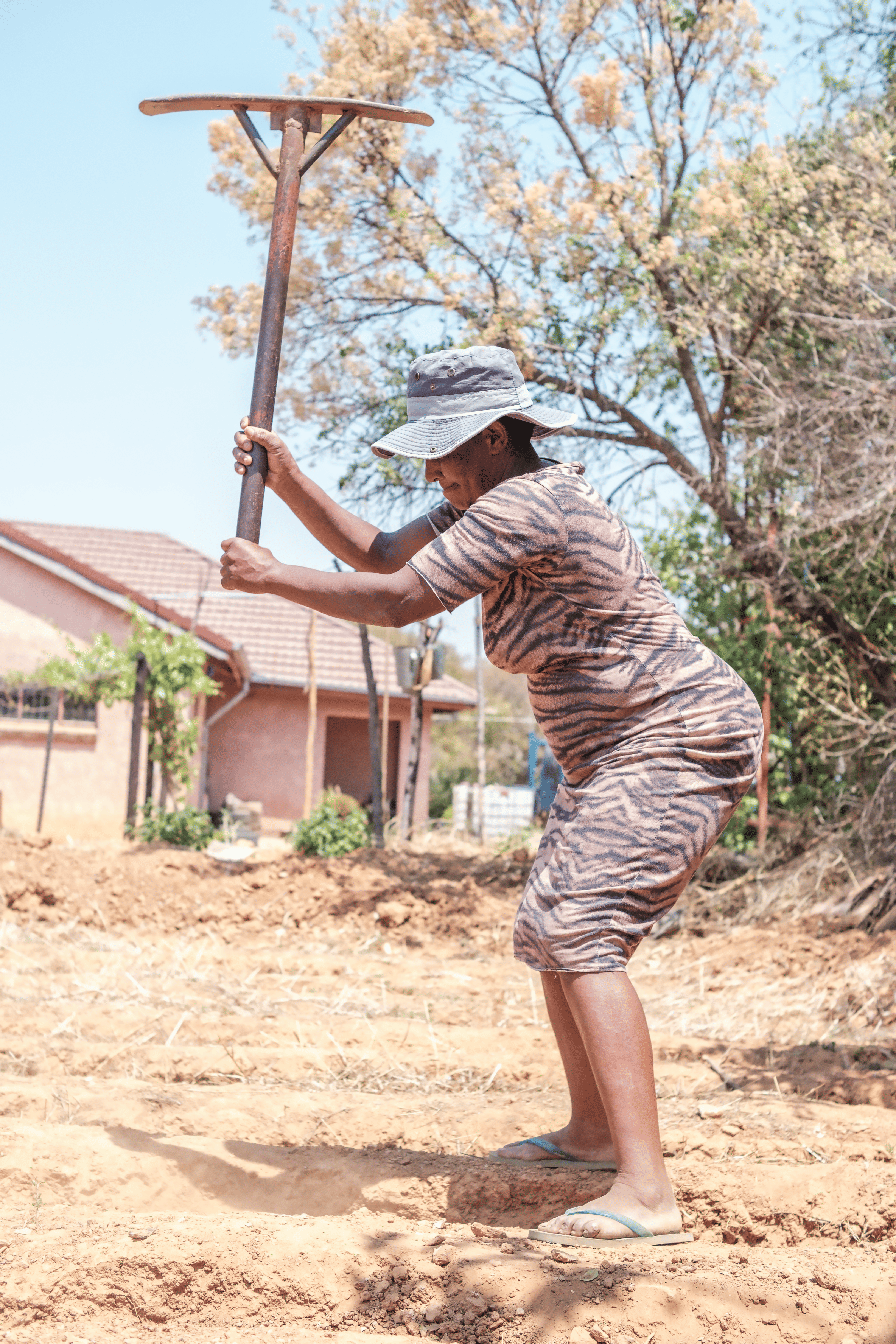 In Mahatshula ist Barbra Mpofu zu sehen, wie sie in ihrem Hof arbeitet. Sie hält eine schwere Spitzhacke fest in den Händen, während sie den Boden rund um ihr Haus verdichtet. Gekleidet in ein Kleid mit Tigermuster, mit einem breitkrempigen Hut gegen die Sonne und einfachen Flip-Flops an den Füssen, arbeitet sie mit ruhiger Entschlossenheit. Jeder Schlag mit dem Werkzeug ist überlegt – Ausdruck der Stärke und Widerstandskraft, die sie in ihre Arbeit einbringt.