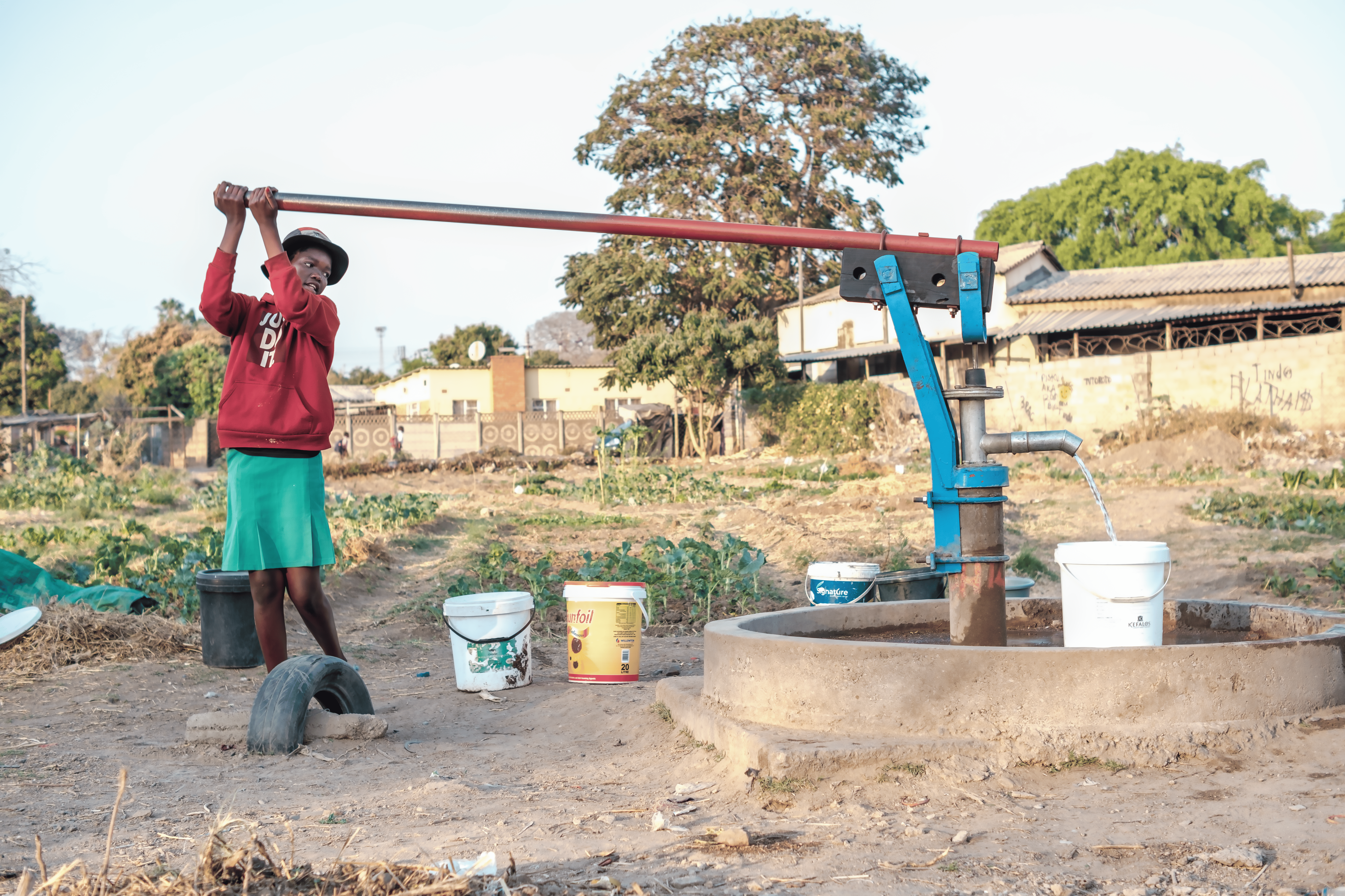 Precious Sibanda ist an einem Brunnen abgebildet, ihre Hände fest am Pumpengriff. Mit jedem Stoss steigt das Wasser aus der Tiefe auf – klar und kühl. Die Sonne brennt, und ihre Arme glänzen vor Anstrengung. Um sie herum warten Plastikbehälter in einer Reihe – einige gehören ihr, andere den Nachbarn. Der Rhythmus ihres Pumpens ist stetig: mehr Kraft, mehr Wasser.