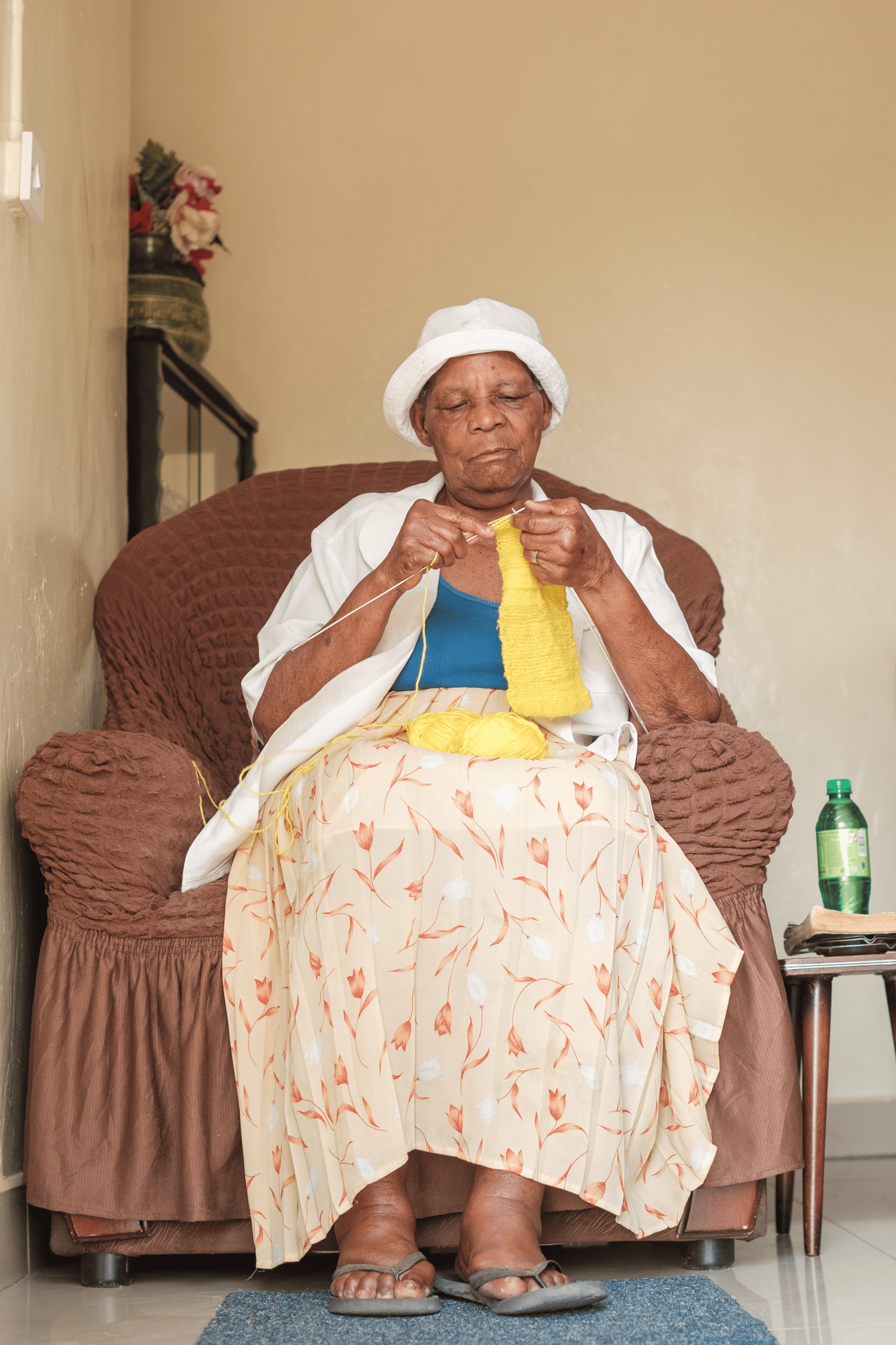 Jede Masche ist gleichmässig, jede Reihe hat ihren Rhythmus – ein beruhigender Takt, der sie seit dem Tod ihres Ehemanns vor zwei Jahren begleitet. Jahrzehntelang waren sie zu zweit, gemeinsam haben sie ihre Töchter grossgezogen, die heute verheiratet sind und ausserhalb des Landes leben. Heute teilt Siphiwe ihr Zuhause mit einer Pflegeperson, und das Stricken ist für sie zu Trost und Gesellschaft zugleich geworden.