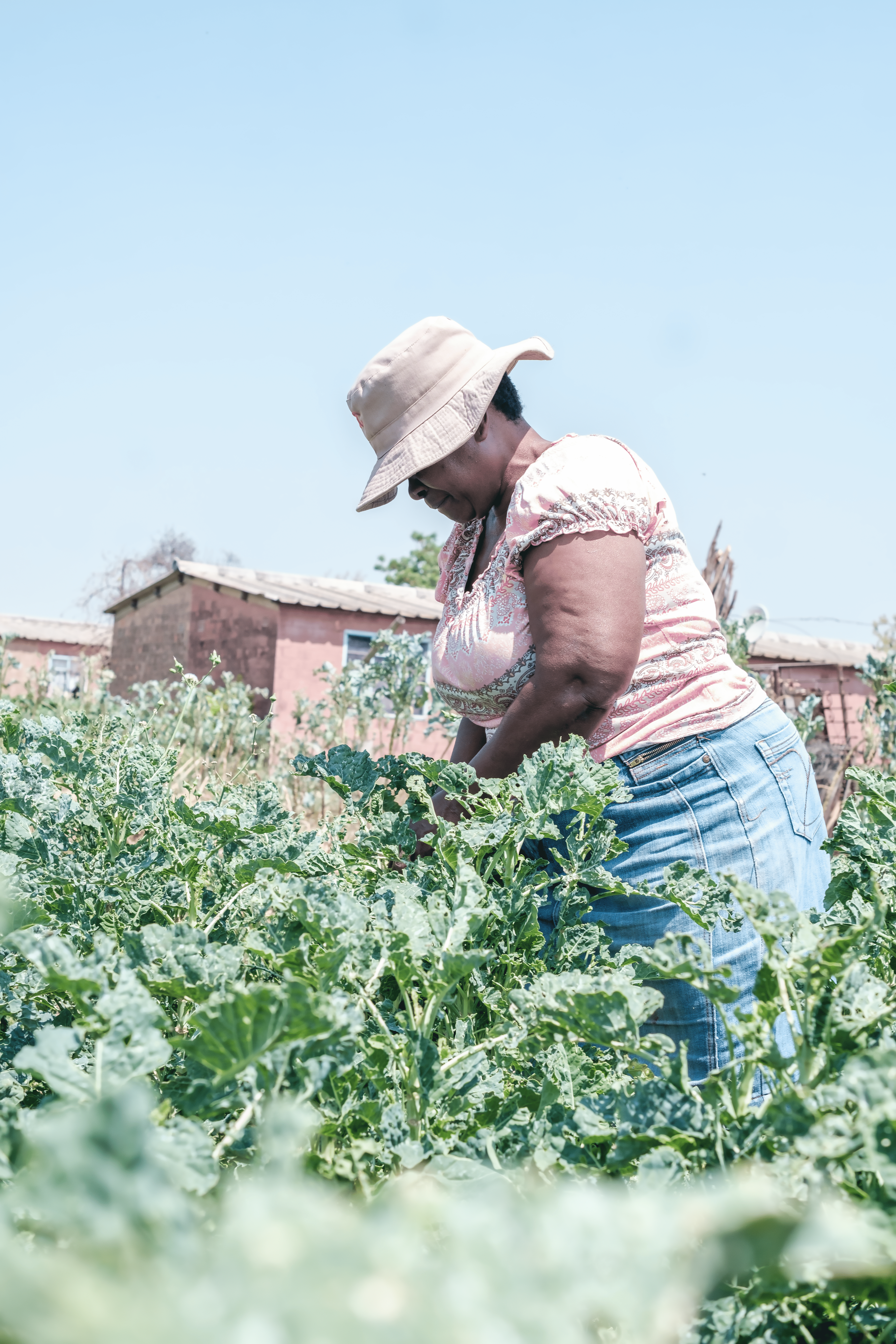In der Hitze von Luveve beugt sich Nokuthula sanft über ihr Beet und pflückt Grünkohlblätter im Schatten ihres Sonnenhuts. Hinter ihr erstrecken sich Reihen von sattem Grün, mit den Häusern ihrer Nachbarschaft in der Ferne. Landwirtschaft ist ihre tägliche Arbeit und ihre Leidenschaft. Von Grünkohl über Mais, Tomaten, Zwiebeln, Süsskartoffeln, Bohnen bis hin zu Karotten hat sie das Land in Nahrung für ihre Familie und Einkommen für ihren Haushalt verwandelt. Sie bereitet auch umfushwa zu – getrockneten Grünkohl, ein traditionelles Grundnahrungsmittel in Simbabwe –, den sie lokal und über die Grenzen hinaus verkauft.