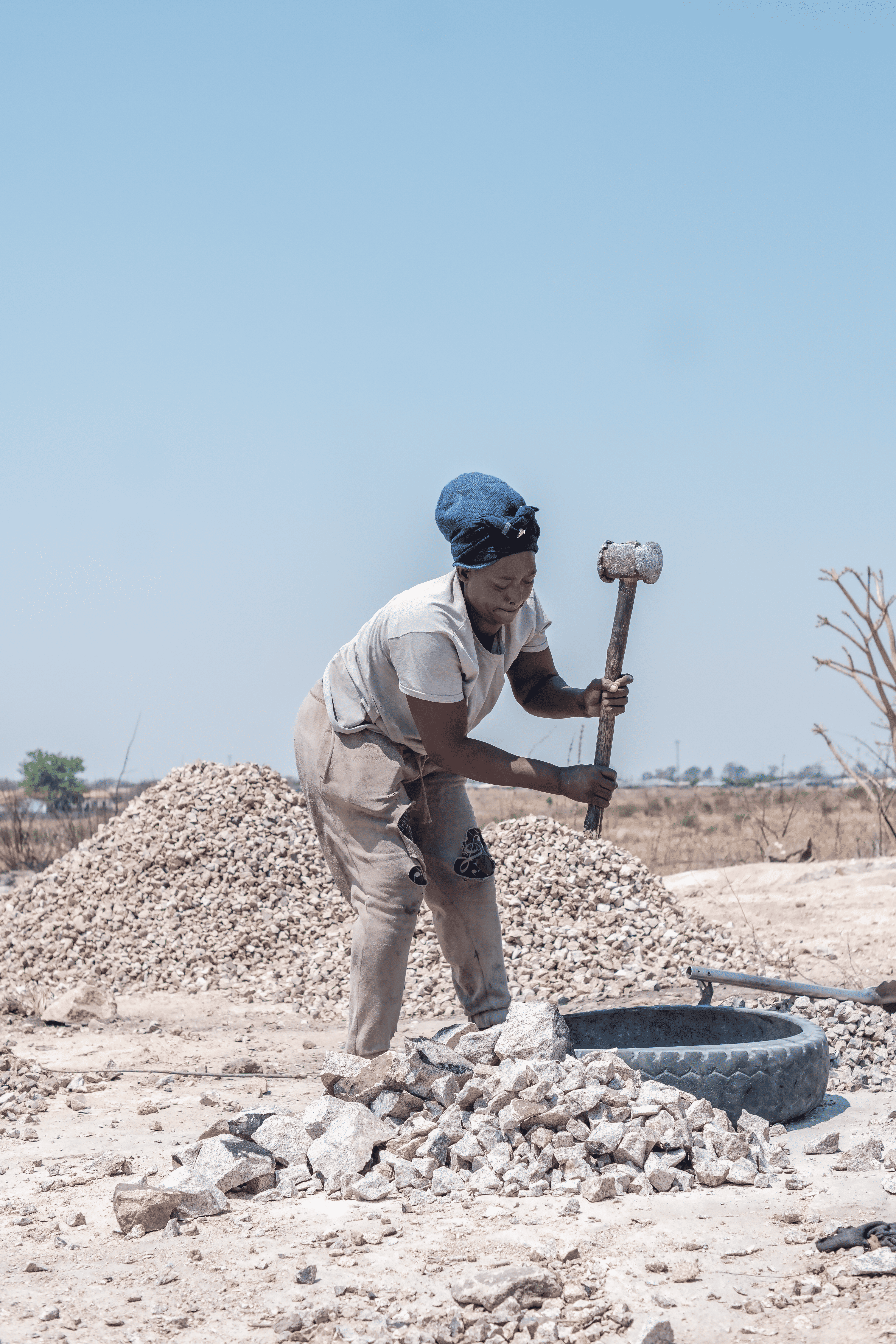 Tief über einen Reifen voller Steine gebeugt, hält Sithembinkosi Siwela den Hammer mit beiden Händen fest. Ihr Körper ist angespannt vor Anstrengung, ihr Gesicht konzentriert. Hinter ihr erhebt sich ein Haufen zertrümmerter Steine – ein stilles Zeugnis vieler Stunden unermüdlicher Arbeit. Seit mehr als fünf Jahren ist dies ihr täglicher Rhythmus: Steine erhitzen, um sie zu schwächen, und sie dann zu zerschlagen, um sie an Bauarbeiter, Hausbesitzer und kleine Zulieferer zu verkaufen, die auf ihr günstiges, lokal beschaffenes Material angewiesen sind.