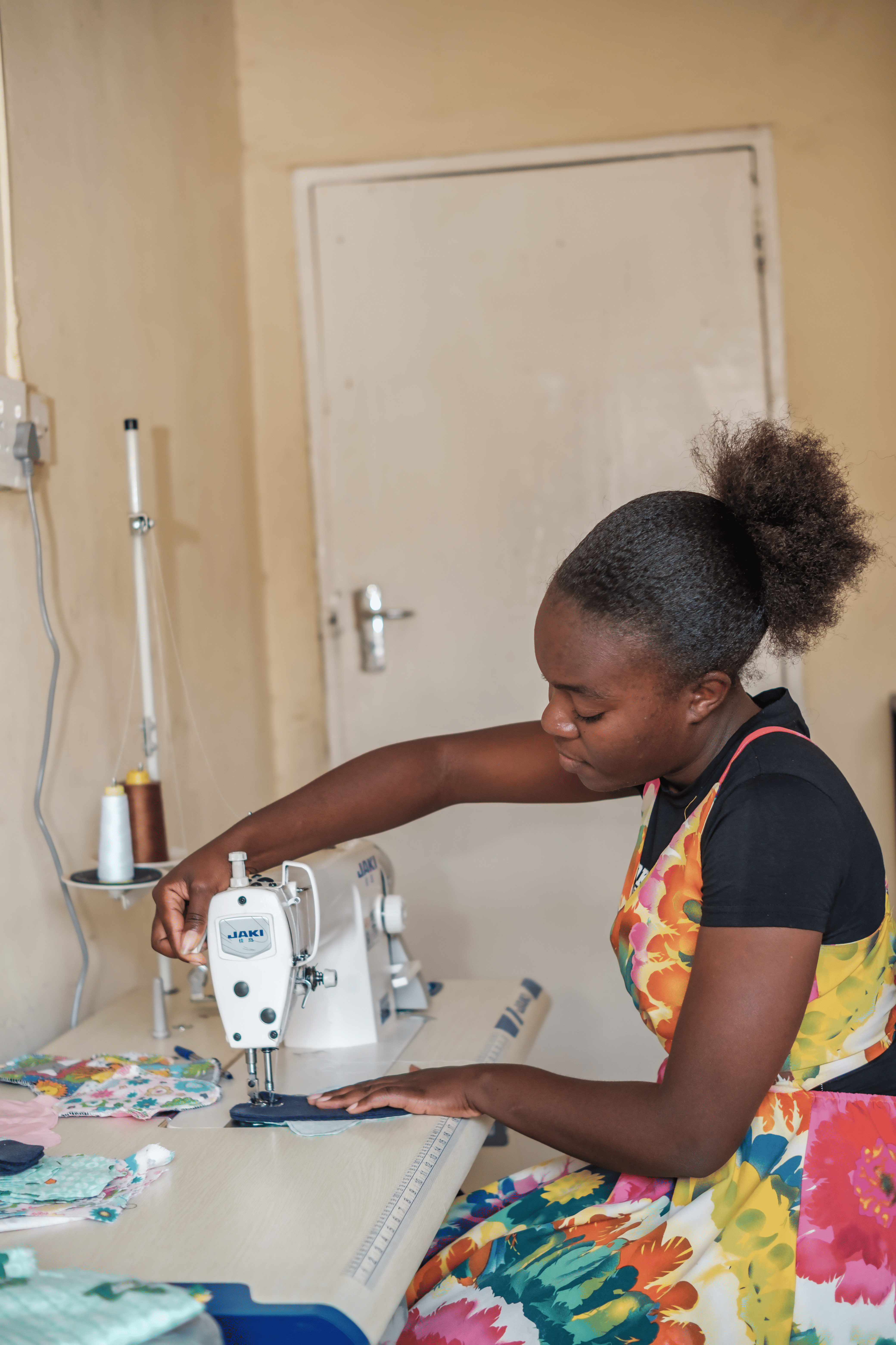 Faith Mafika sitzt vor ihrer Nähmaschine und näht Stoffstücke zu wiederverwendbaren Binden zusammen. Diese spendet sie an Mädchen aus einkommensschwachen Familien, weil sie weiss, dass sich viele keine Einwegprodukte leisten können. Für sie sind wiederverwendbare Binden nicht nur nachhaltiger – sie helfen auch, dass Mädchen regelmässig zur Schule gehen können, ohne aus finanziellen Gründen zu fehlen.