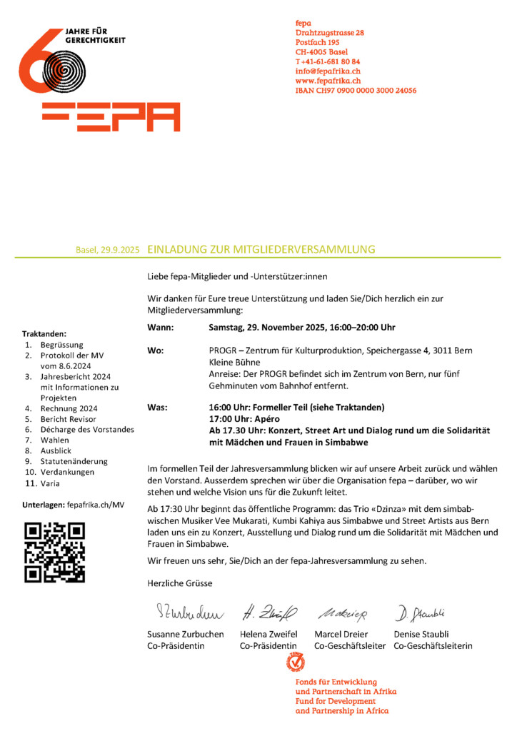 Wir freuen uns, Sie an der MV zu begrüssen. Die Jahresversammlung ist für alle offen. Im öffentlichen Programm berichtet die Studienreisegruppe Simbabwe 2024