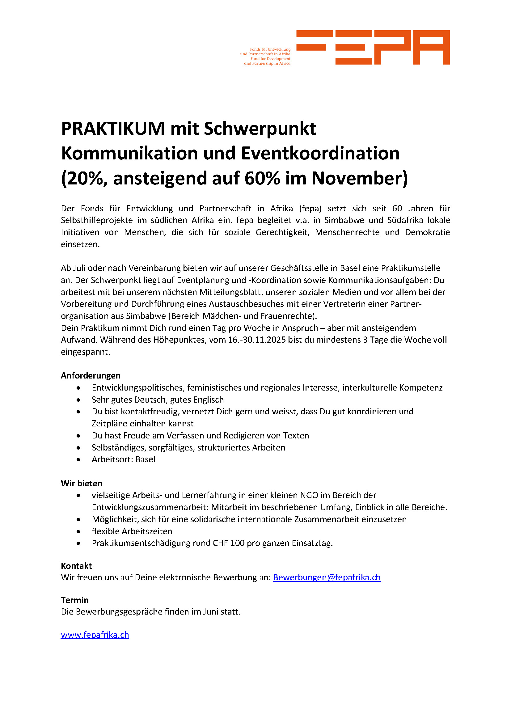 Ab Juli oder nach Vereinbarung bieten wir auf unserer Geschäftsstelle in Basel eine Praktikumstelle an. Der Schwerpunkt liegt auf Eventplanung und -Koordination sowie Kommunikationsaufgaben: Du arbeitest mit bei unserem nächsten Mitteilungsblatt, unseren sozialen Medien und vor allem bei der Vorbereitung und Durchführung eines Austauschbesuches mit einer Vertreterin einer Partnerorganisation aus Simbabwe (Bereich Mädchen- und Frauenrechte).